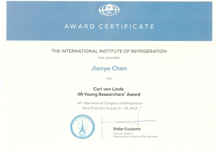 2023年8月21-25日,由国际制冷学会(The International Institute of Refrigeration, IIR)主办的第26届国际制冷大会(The 26th IIR International Congress of Refrigeration, ICR 2023)在法国巴黎举行。大会期间颁发了国际制冷学会青年学者奖,公司陈建业副教授被授予了卡尔林德奖(CARL von LINDE AWARD)。