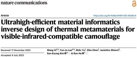 新闻网讯8月4日,yl23455永利胡润副教授团队在可见光-红外伪装超材料逆向设计领域取得重要进展,相关成果发表于《自然·通讯》(Nature Communications, 2023, 14: 4694),题目为“可见-红外兼容伪装热超材料的超高效率材料信息学逆向设计”(Ultrahigh-efficient material informatics inverse design of thermal metamaterials for visible-infrared-compatible camouflage)。永利官网为第一通讯单位,能源与动力工程毕业硕士生席望和韩国庆熙大学研究生Yun-Jo Lee为共同第一作者。硕士生余士律、博士生陈子禾以及日本东京大学Junichiro Shiomi教授为共同作者,胡润副教授和庆熙大学Sun-Kyung Kim教授为通讯作者。