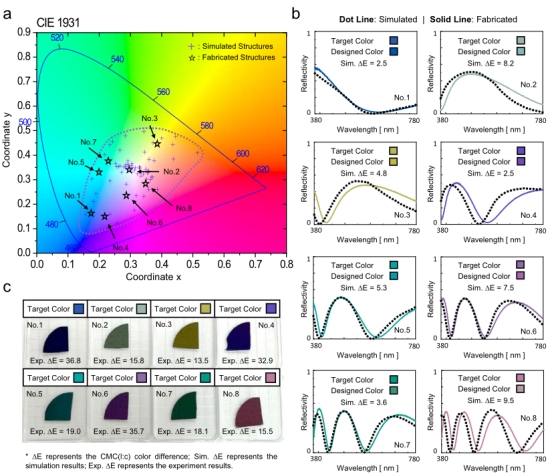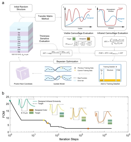 为了解决上述问题,胡润副教授团队提出了一种基于材料信息学(MI)的逆向设计框架,通过仅评估约1%的候选材料,有效地设计多层锗(Ge)和硫化锌(ZnS)超材料。通过实验验证,所设计的超材料在不同的观察角度和温度下均表现出优异的颜色匹配性能和红外伪装性能。设计流程包括将多层超材料编码为二进制数字、使用TMM进行物理模拟、可见光和红外伪装评估、厚度评估的发射率灵敏度、性能表征(FOM)和贝叶斯优化过程(BO)。该超材料结构包括生长在石英衬底上的非周期Ge和ZnS多层层以及最上层的ZnS层。顶部ZnS层用于可见光伪装,而底部的Ge/ZnS多层用于红外伪装。为评估可见光伪装性能,将获得颜色与目标颜色在CIE-LCH色彩空间中的色差(ΔECMC(l:c))作为评估指标。为评估红外伪装性能,同时考虑了发射率光盘和目标温度,定义了一个无量纲红外伪装评价因子——热信号比(RTS),用于表示设计的超材料在相同环境(但不相同温度)下与黑体的热辐射功率之比。除了可见光和红外伪装性能外,还首次评估了实验制造的厚度灵敏度(SET),并将其反馈到优化中。将ΔECMC(l:c)、RTS、SET的乘积作为最终的FOM。通过BO使FOM最小化,可以有效地优化超材料结构,在迭代步骤<总候选项的1%内达到最优值。作者对不同颜色目标进行了60轮优化,得到了其在CIE1931色彩空间中的分布,表明了超材料结构可以达到的可行的颜色范围。随机选择了8种超材料结构进行制备和实验验证,展现了出色的角度和温度无关的可见-红外兼容伪装性能。