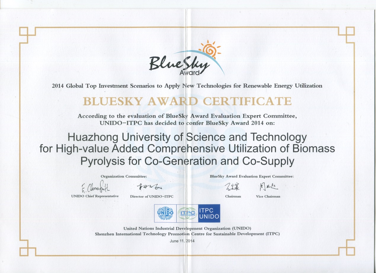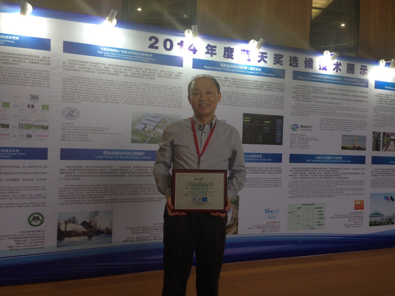 在6月11日举行的深圳国际低碳城论坛上,2014年度“全球可再生能源领域最具投资价值的领先技术蓝天奖”揭晓。yl23455永利陈汉平教授团队的“生物质热解联产联供综合利用技术”荣获“蓝天奖”。