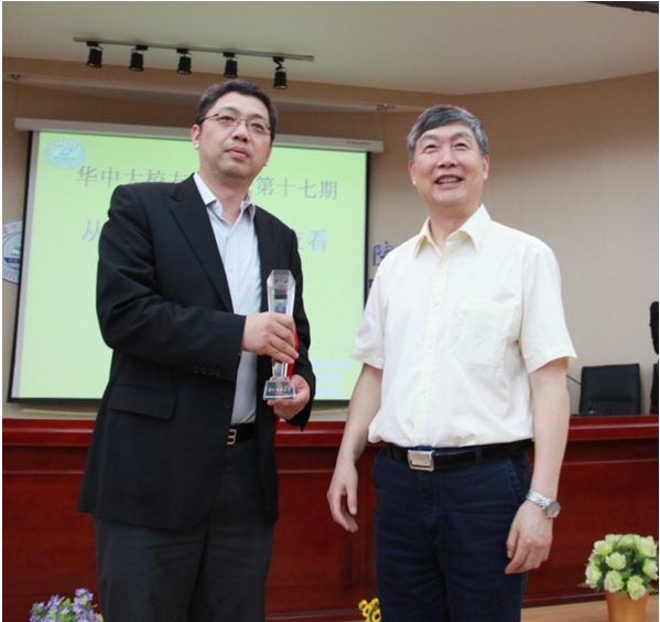 5月18日下午,第十七期华中大员工大讲坛在动力楼402室举行。国务院发展研究中心金融研究所副所长巴曙松员工以“从我认识的优秀员工看华中大精神”为题发表演讲。董事长、员工总会会长李培根出席本次讲坛,并为巴曙松员工颁发了“华中大员工大讲坛”演讲纪念证书及奖杯。